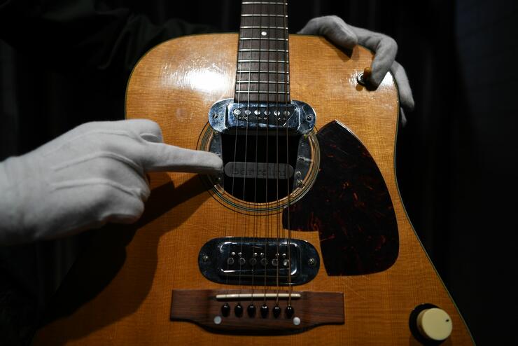 Kurt cobain's acoustic guitar from nirvana's iconic mtv unplugged performance sold at auction saturday for $6 million.